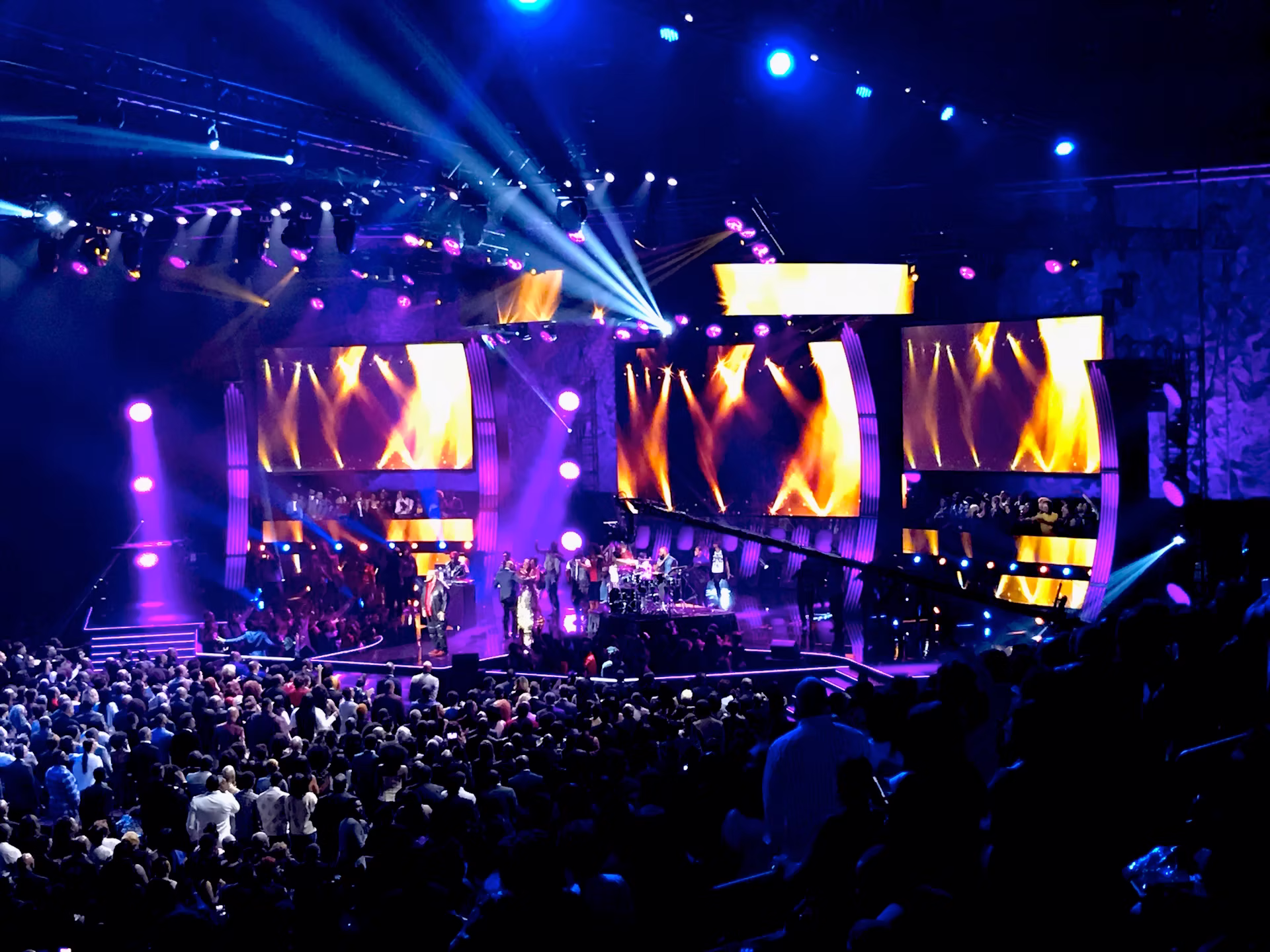 Central City Productions asked us to create a new production design concept for the Stellar Awards. Working closely with director Michael Johnson, we developed a large performance space with sweeping back-lit columns, a curved video header, a ground row piece that included cut-outs for Mark Carver's floor lighting fixtures, multiple video displays, two "pits" for audience interaction at the feet of the artists and two locations upstage with energetic audience members. We also included a custom installation of our proprietary Edgelight product around the perimeter of the stage and the outside staircases. Christian Scenic built all the necessary staging and we fabricated all of the scenic pieces in house.
